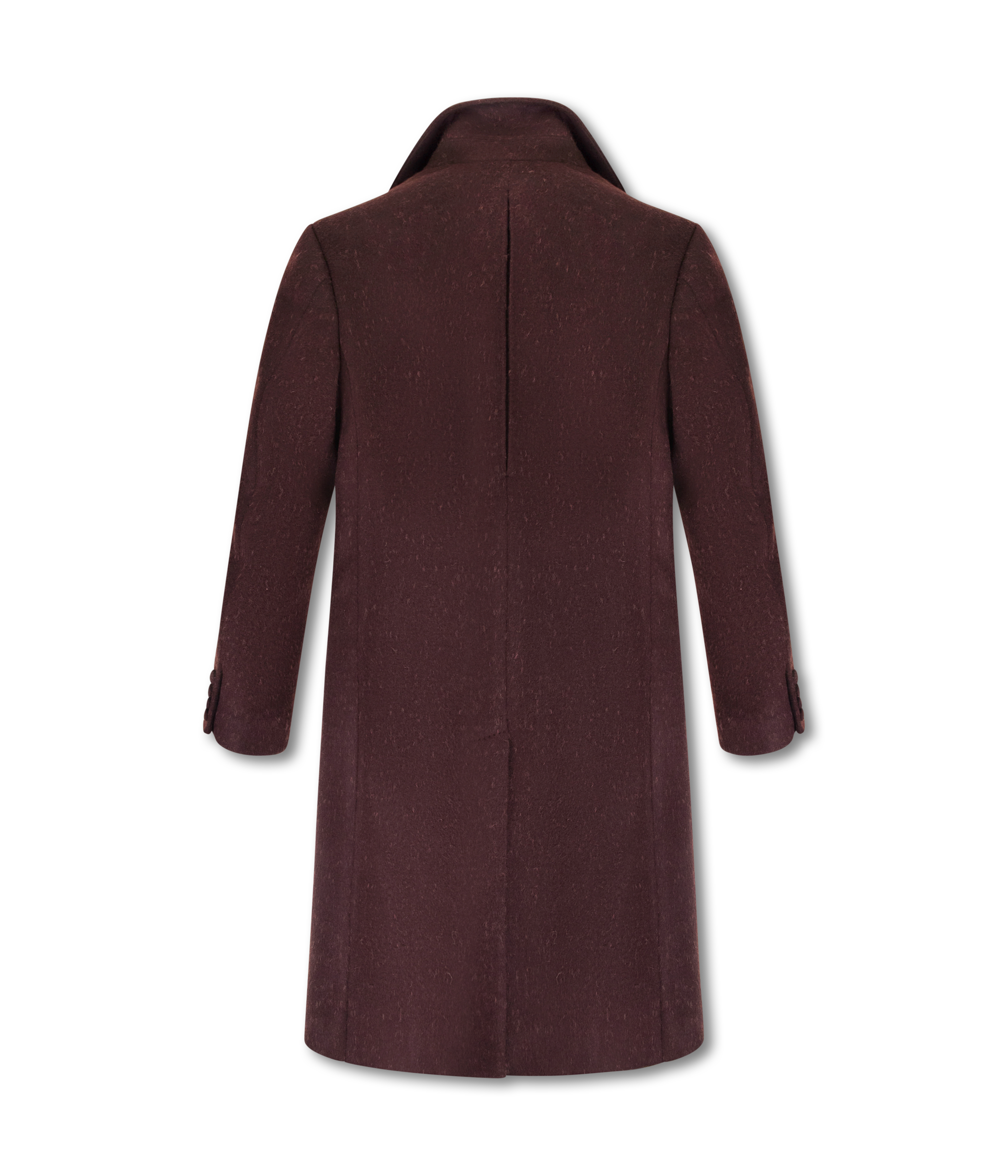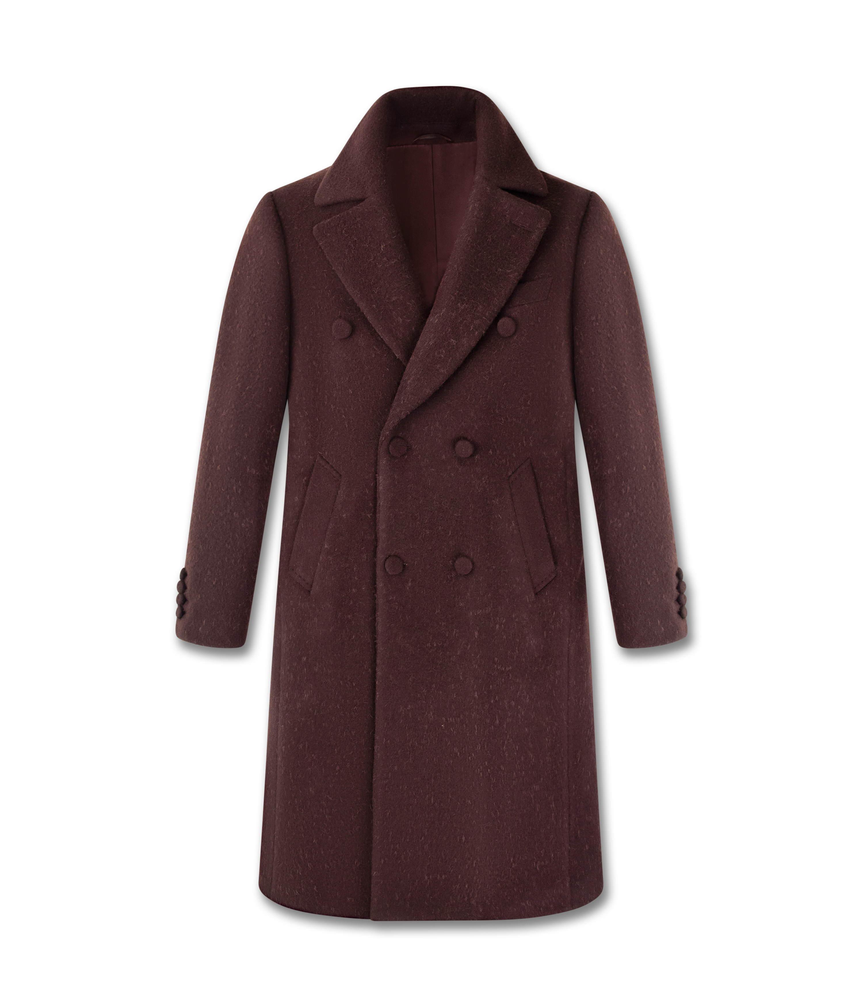 Crafted from a rich wool cashmere blend in a deep oud hue, this double breasted overcoat combines structure and softness. Refined lapels, hand finished details, and a sleek satin lining create a silhouette of timeless sophistication and understated power.
